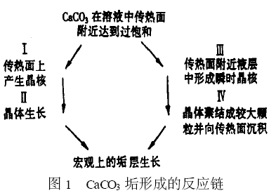 在非沸腾条件下,对传热面垢层生长起主要作用的是传热面上的晶体生长过程,即以按( Ⅰ)→( Ⅱ) 进行的过程 ,见图1。然而,传热面附近液层中尚存在一定数量的瞬时晶核,它们是处于 过渡状态的一种中介微晶粒子,通过相互间的聚结容易形成稳定的大颗粒并进而在传热面上沉积,从而对结垢亦有一定贡献,这就是按( Ⅲ) →( Ⅳ) 进行的过程。